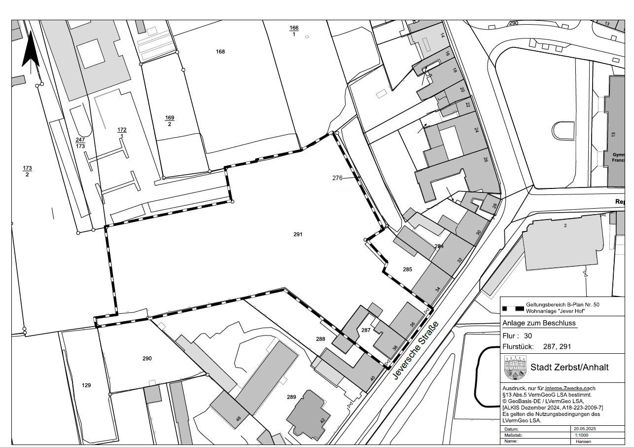 Der Stadtrat hat am 25.06.2025 in öffentlicher Sitzung den Beschluss zur Aufstellung des Bebauungsplanes Nr. 50 „Jever Hof“ der Stadt Zerbst/Anhalt gemäß § 1 Abs. 3 i. V. m. § 13a sowie § 2 Abs. 1 BauGB gefasst (BV/0190/2025).